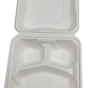- Bagasse ClamshellA-8″ 3- compartment Clamshell